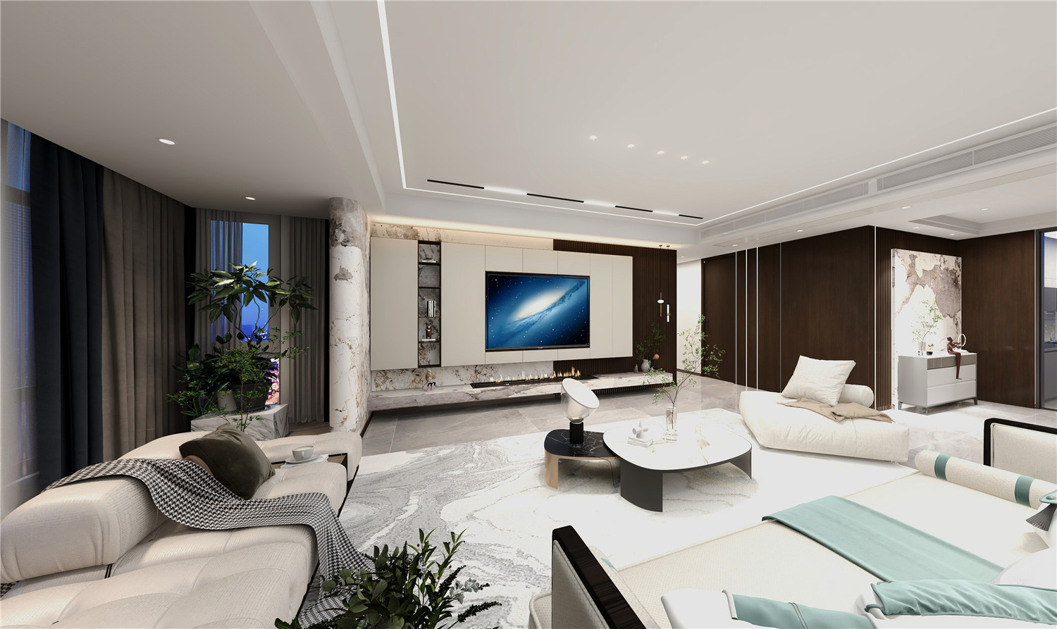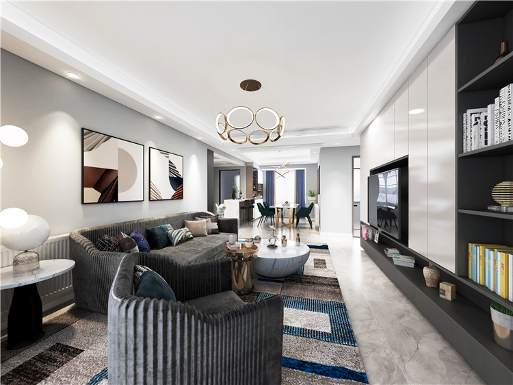 客廳以低飽和度的家具裝飾為主,設(shè)計師選擇了比較精致的沙發(fā)和地毯,同時在搭配上流利的裝飾畫,突出了客廳的簡約與精致;電視墻的設(shè)計以功能性為主,黑白二色的相互融入,令室內(nèi)變得更加高級。