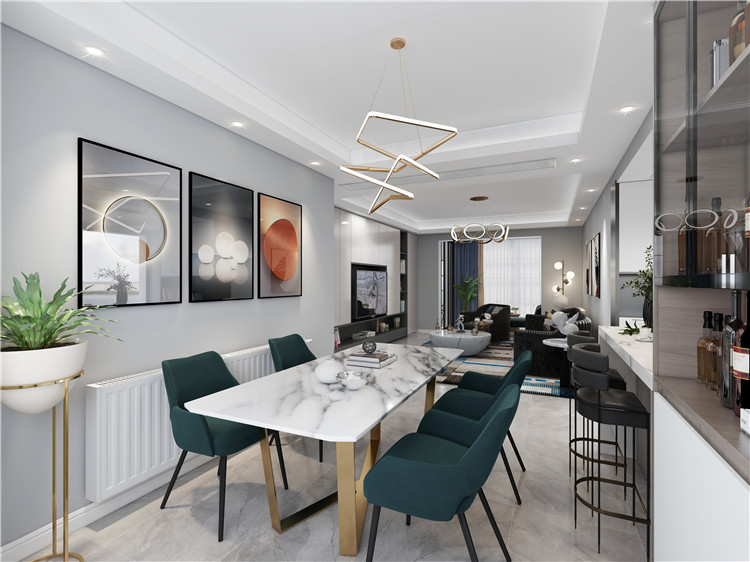 餐廳的細節(jié)可以感受到現(xiàn)代簡約風格自帶的溫馨之感,大理石餐桌搭配墨綠色餐椅,讓空間變得更加時尚,裝飾畫、燈具和綠植的點綴,賦予了空間活力與生機。