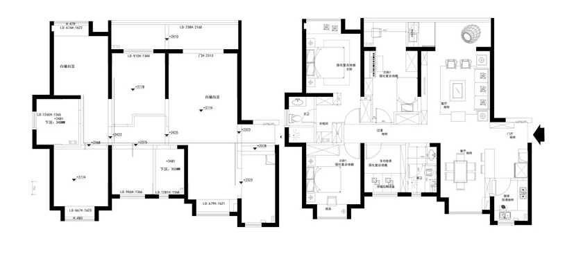 戶型格局總體方正,原始戶型中,客餐空間畸角處多,空間利用不合理,多處零碎空間沒有得到規(guī)劃,設(shè)計師將廚餐開放式設(shè)計,并通過過道劃分出客廳與餐廳,功能區(qū)變得更加敞亮了;臥室雖然集中分布,但舒適度不高,設(shè)計師在主臥中設(shè)計了衛(wèi)生間,公衛(wèi)干濕分離,提升了居住的舒適度。