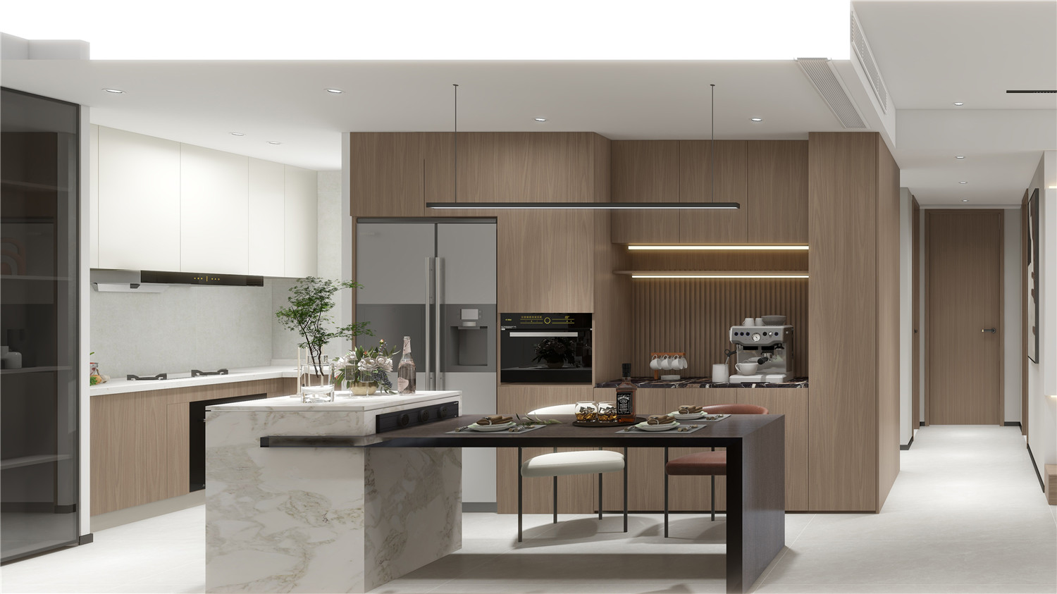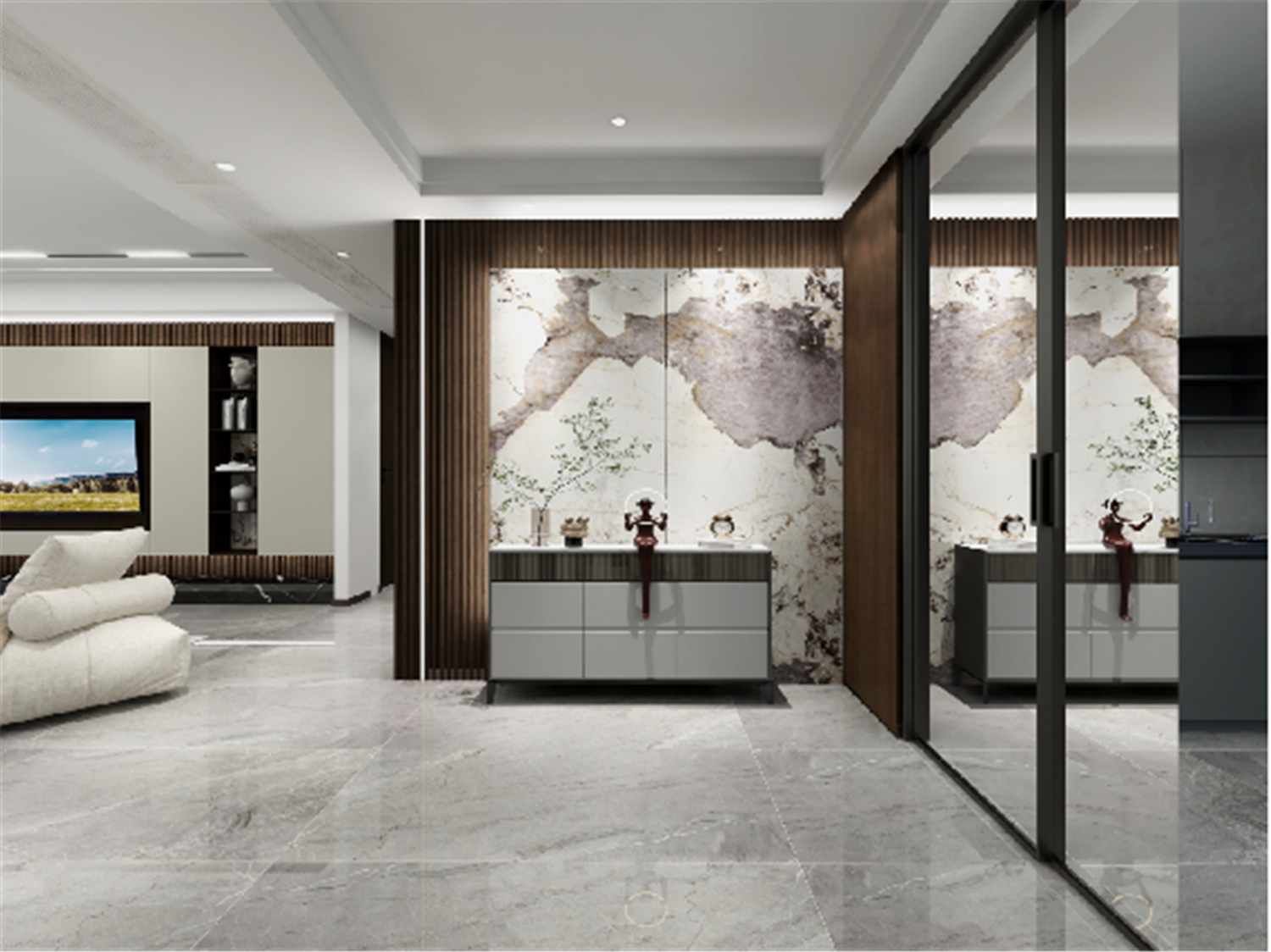 走廊的設(shè)計主要在頂面和地面,吊頂與地磚都采用矩形線條勾勒,提升了過道的空間感,在燈光的渲染下,為整個空間帶來了中式格調(diào)。