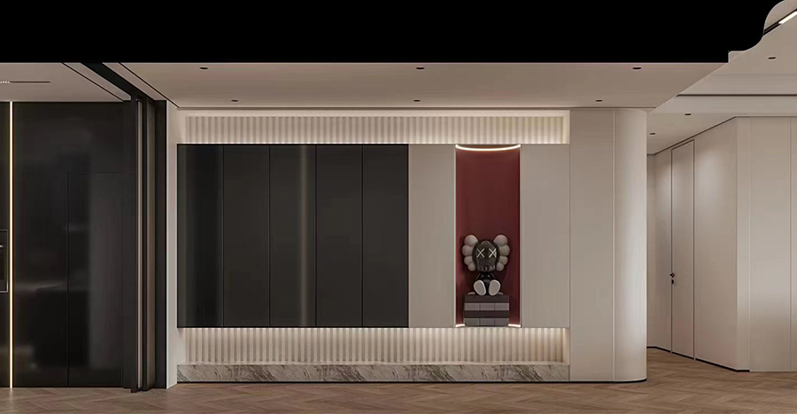 玄關(guān)區(qū)域借助木質(zhì)置物柜簡(jiǎn)約清新而又實(shí)用,滿足主人出入戶時(shí)的衣物放置、替換需求。