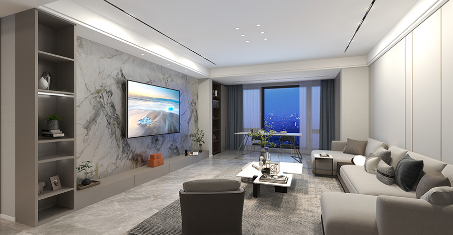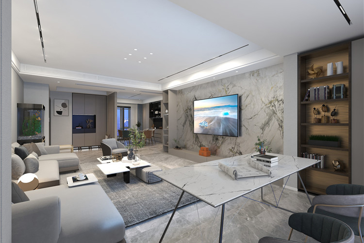 客廳當(dāng)中以大地系配色為主,灰色大理石與沙發(fā)相互點綴,在軌道燈的相互映托下,整個空間變得更加溫馨低奢。