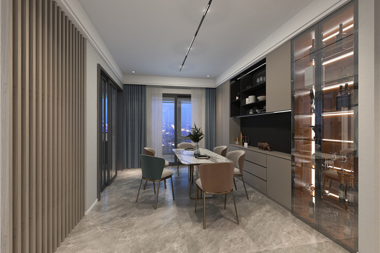 餐廳采用無主燈設(shè)計,頂面以軌道燈和筒燈為主,無形中拉升了空間的層高,背景墻看起來非常簡潔,餐邊柜收納功能強大,美觀與實用性兼具,燈帶的鋪貼給人帶來一種舒適的感覺。
