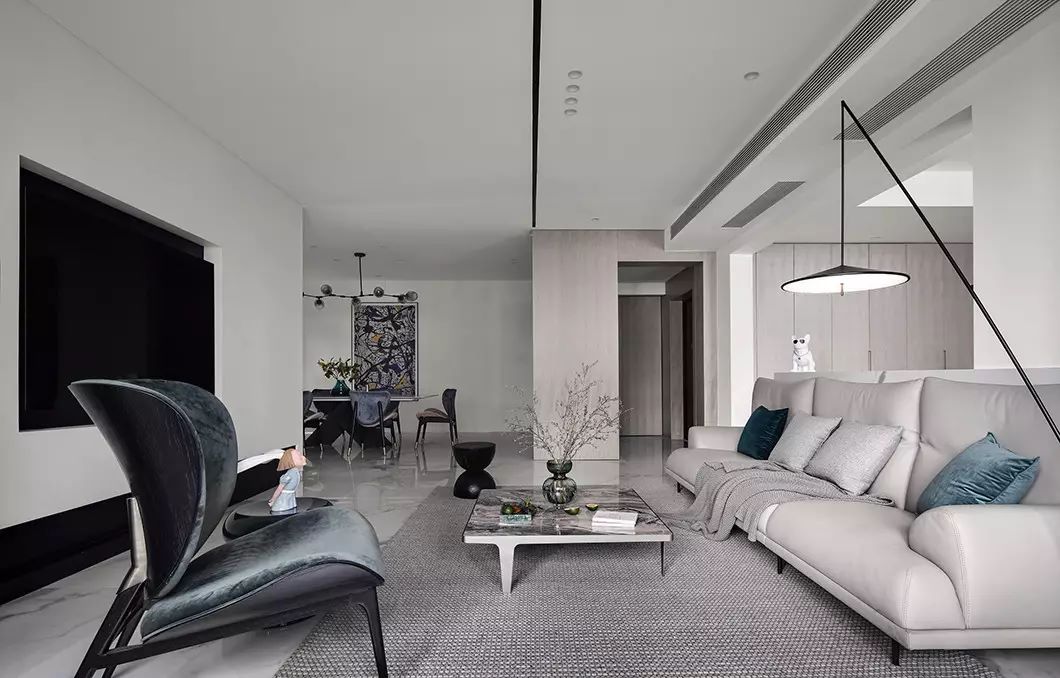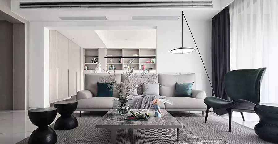 這套位于綠地金融國際城的四居室房屋面積雖然在220㎡左右,但是由于戶型并不方正平整,且存在著零碎角落,因此存在著較大的設計難題。為了讓所有的空間都得到合理的充分利用,化解戶型缺陷,設計師對空間進行了再規劃,將入戶處左邊的狹長條區域打造成廚房,利用戶型的轉折減少油煙進入生活空間的概率。同時將該區域進行一定的再切割,規劃出一塊置物空間,有效提升了家居空間的利用率。