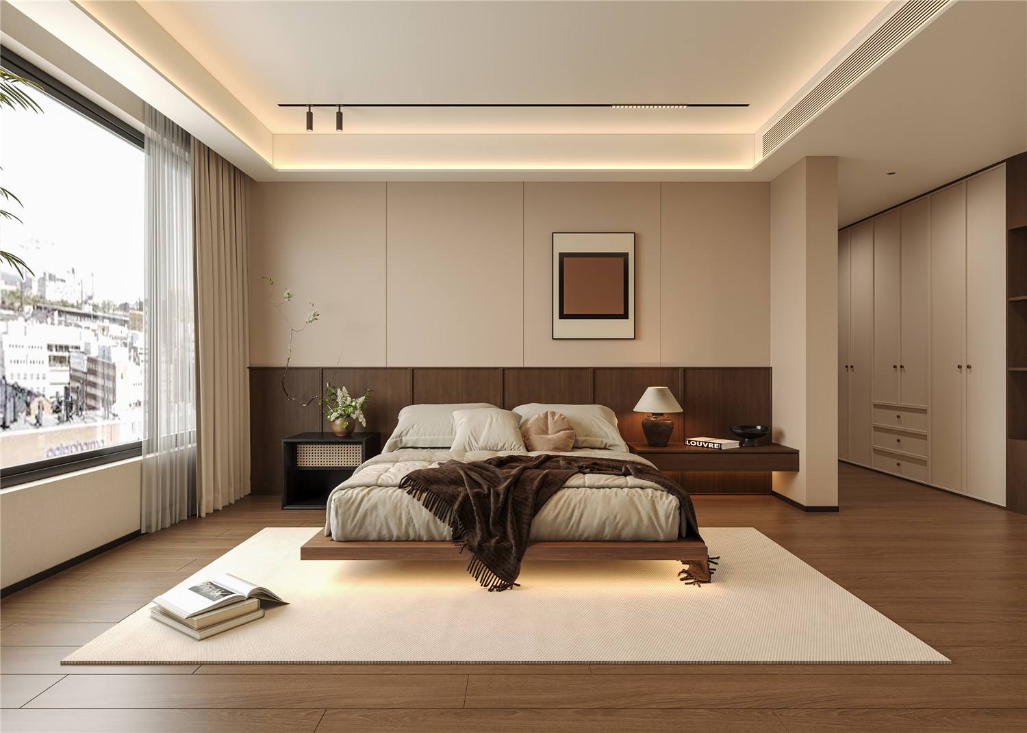 臥室仍舊保持了奶茶色的色調,每一處空間合理利用的同時,墻上掛畫都是獨特的現代簡約風格。