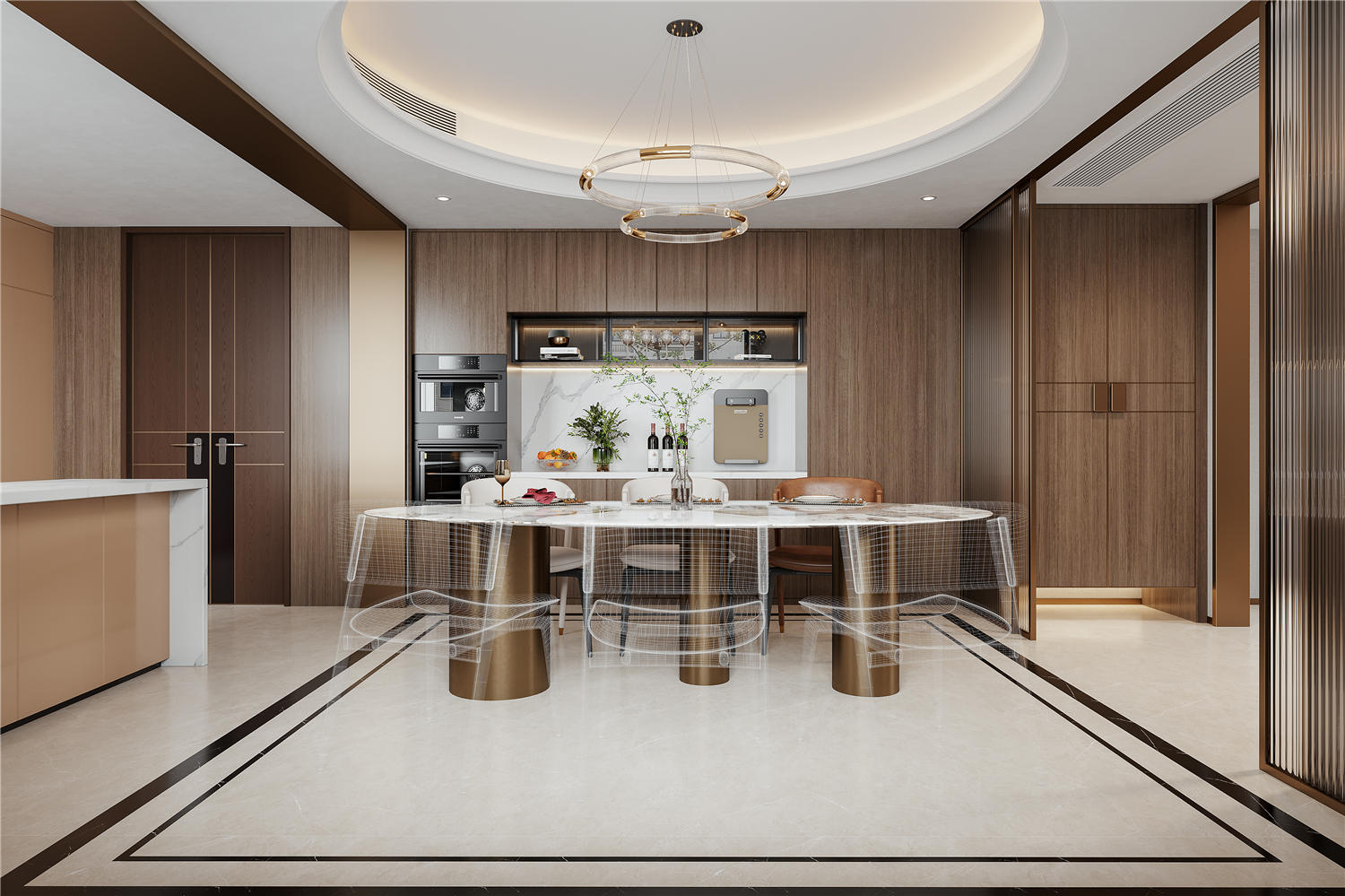 2 餐廳設(shè)置操作柜,提升利用率,滿足各種廚電的擺放。