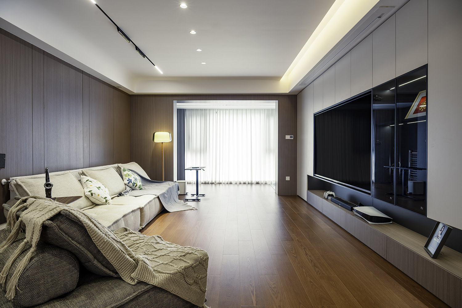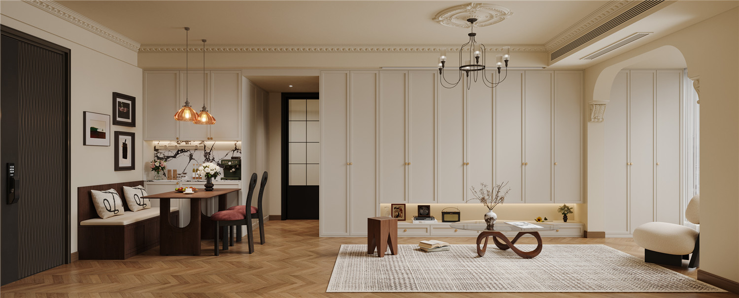 2、入戶定制玄關(guān)柜銜接餐邊柜、電視背景墻、儲物柜,兼顧美觀與實用
