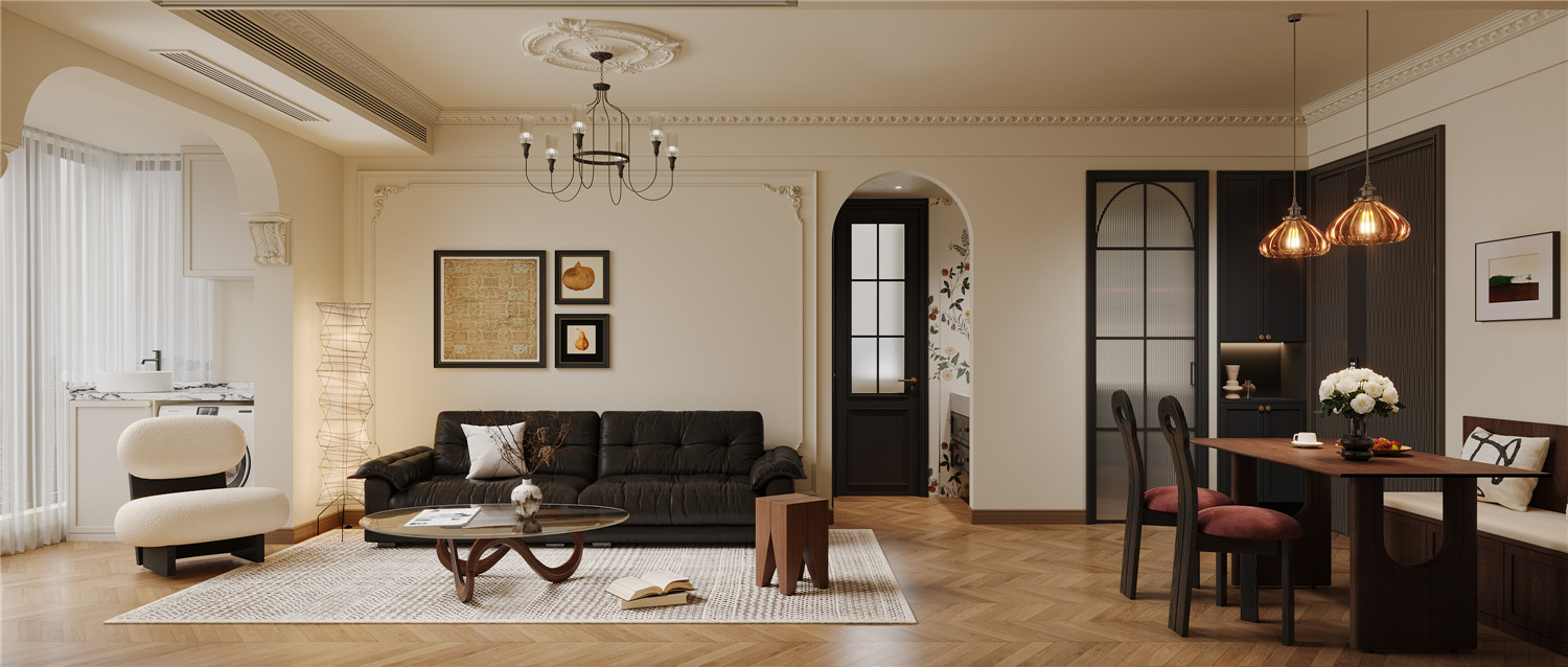 2 餐廳與客廳之間采用可開可合的玻璃門隔斷,合上時隔絕油煙,打開時空間互聯(lián)。