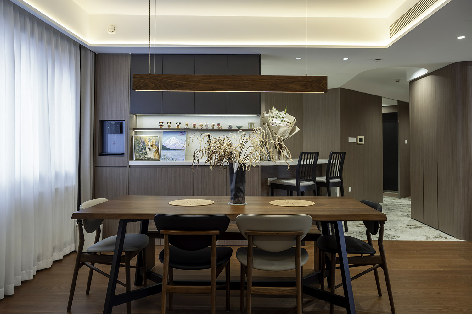 2 從玄關(guān)餐廳整墻一體柜,視覺感延伸強;鞋柜餐邊柜加展示區(qū)加儲物柜的功能,擁有超強收納。