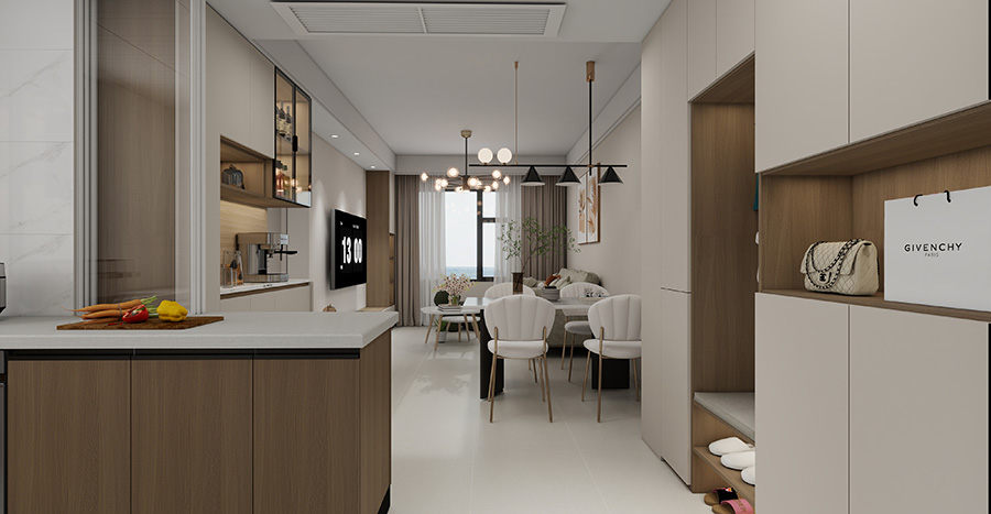 ①    借用部分客房空間,定制一體化鞋柜、餐邊柜,并嵌入冰箱,打造整齊空間。