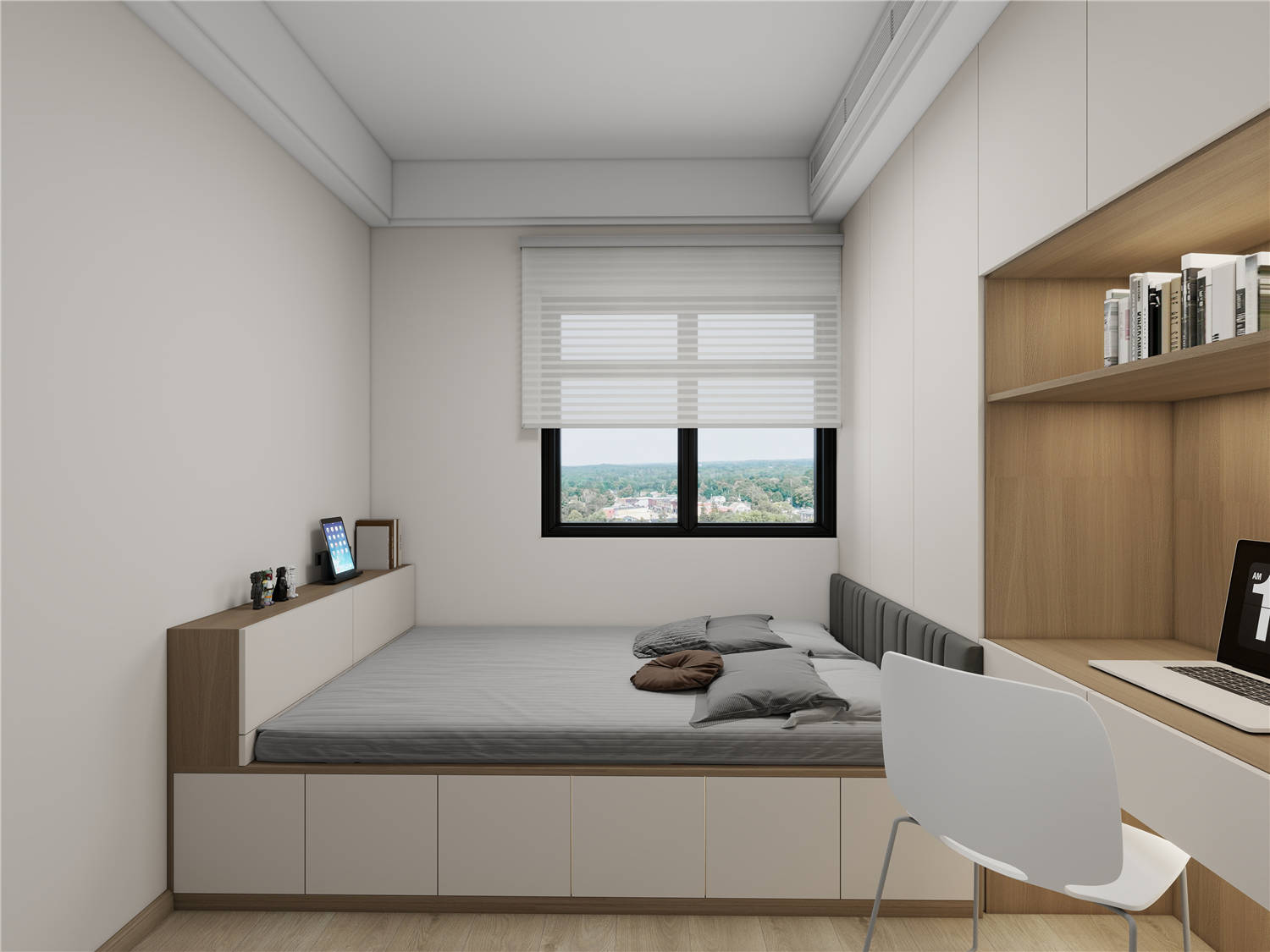 預留一間客房,供親朋好友來訪時休憩。此外,這里也是靜謐的辦公區,書桌之上,設置兩排置物擱板,既可用于展示,又具有收納功能,整體設計簡潔,完美融入臥室的寧靜氛圍。
