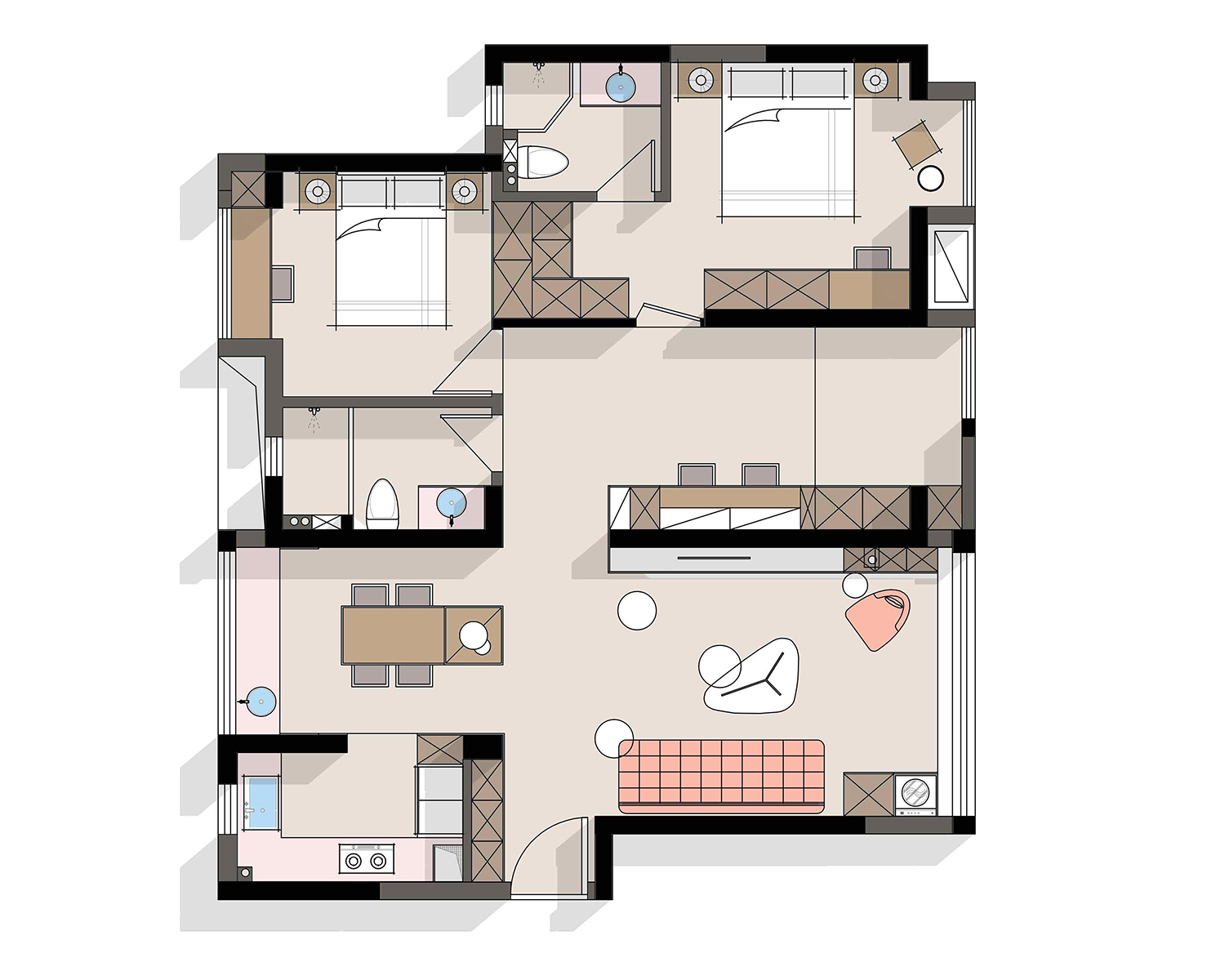 2、主衛適度外擴,融入浴缸與獨立淋浴間;主臥增設整墻衣柜在床尾,優化收納空間。