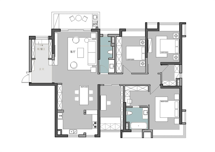 名都花園這套165㎡的四居室房屋整體的戶型結構四方且平整,已經完成了基本的功能分區,不過部分細節處理并不夠合理,因此設計師進行了部分的調整。原入戶處玄關的遮擋較多,設計師將玄關與客廳的墻面打通一部分,避免玄關區域過于封閉而帶來壓迫感。同時由于走廊過道相對比較狹長,設計師借助了一些軟裝設計來降低走廊區域的封閉感與單調感,進而提升整體家居的格調品質感。