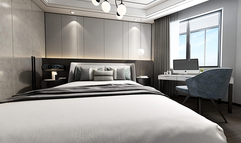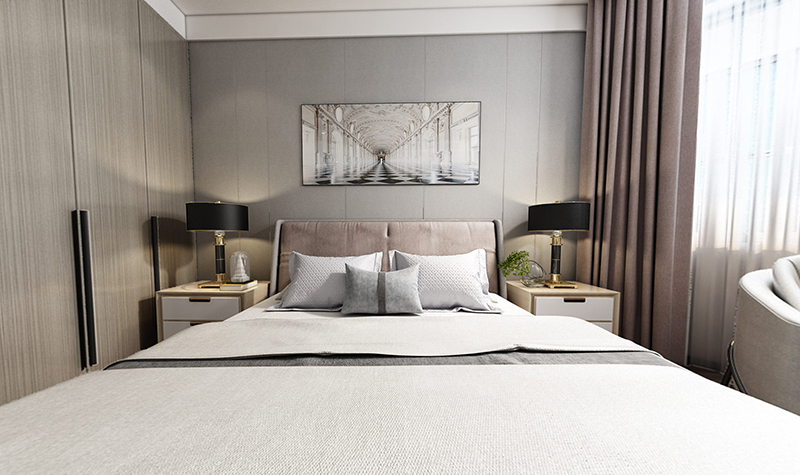 臥室區(qū)域使用了簡單的淡色系色彩裝飾空間,灰色的沙發(fā)、床頭背景墻搭配上藕粉色的窗簾,強調一種柔和溫馨感;黑色的臺燈搭配上藝術感十足的掛畫,則為空間增添了一抹現(xiàn)代時尚氣息。