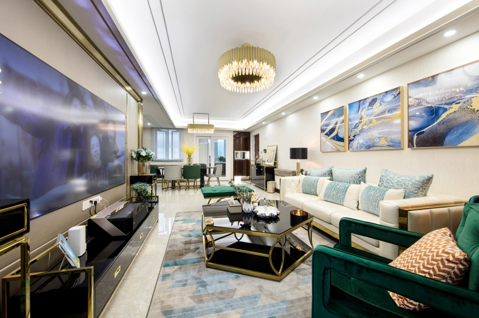 白色水泥墻搭配上鑲金邊處理的電視背景墻,一種典雅的輕奢氛圍呼之欲出。綠色的絲絨沙發,則讓空間的色彩感更為跳躍活潑。