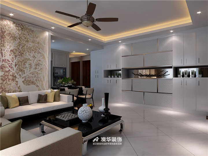整體以白色為主,頂面和電視墻燈帶相互糅合后,呈現出獨特的視覺觀感,布藝沙發圍合式放置,滿足了家庭日常社交需求,地面增置圓形地毯,與方形吊頂對立碰撞,提升了空間的層次感,沙發左側空間設以收納柜面,簡單的線條勾勒出時尚沉穩的力量。