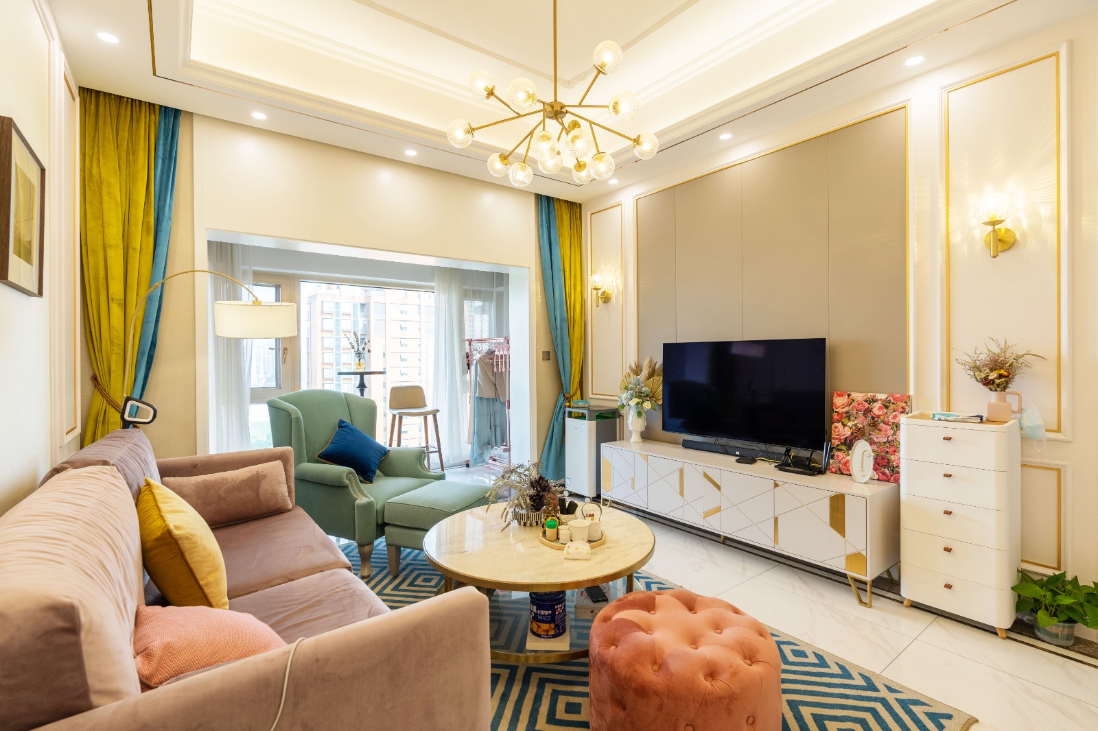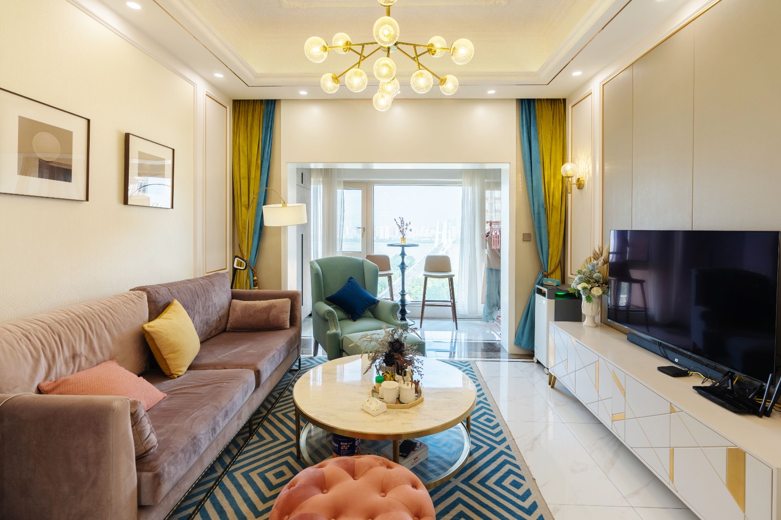 客廳區域主要通過各類色彩來營造空間的精致感與溫馨氛圍。絲絨材質的藕粉色沙發與藍色幾何圖形地毯之間的碰撞高級而又耐看。墻面的金色鑲邊處理,則讓空間的歐式貴族風情得到展露。