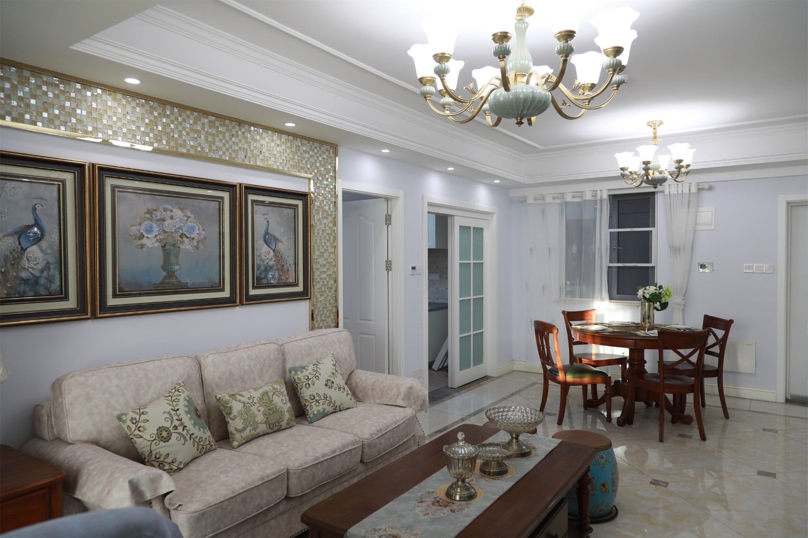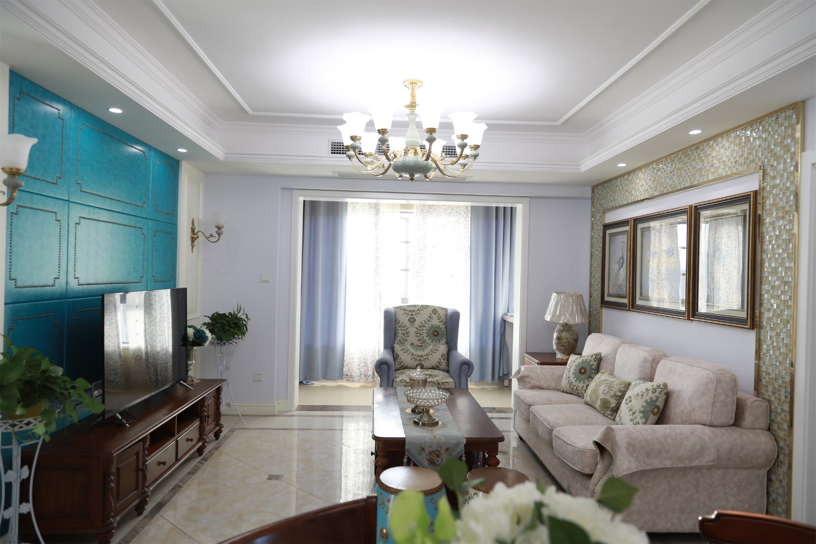 淡藍色的墻面搭配上淺色暗紋的沙發,低調中又帶有一抹淡淡的清新氣息。木質桌子則與不易沙發之間形成碰撞,提升了空間的立體感與質感。