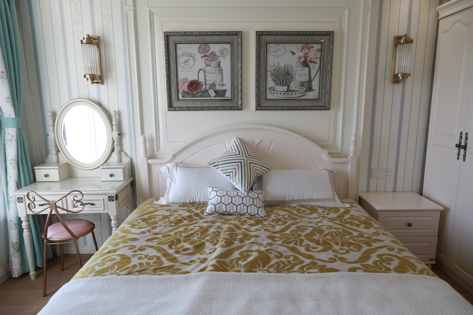 素色條紋壁紙搭配上淺藍色田園風窗簾,清新典雅而又不失自然浪漫風情。
