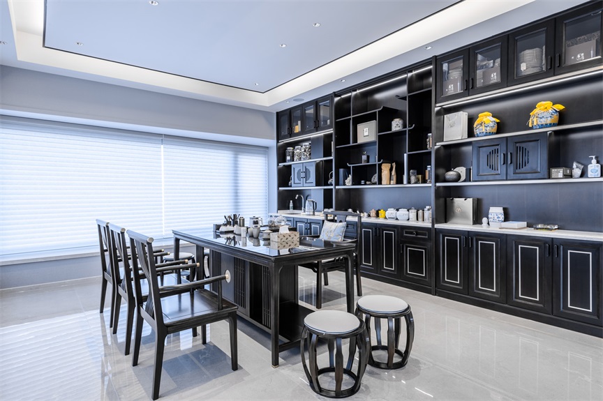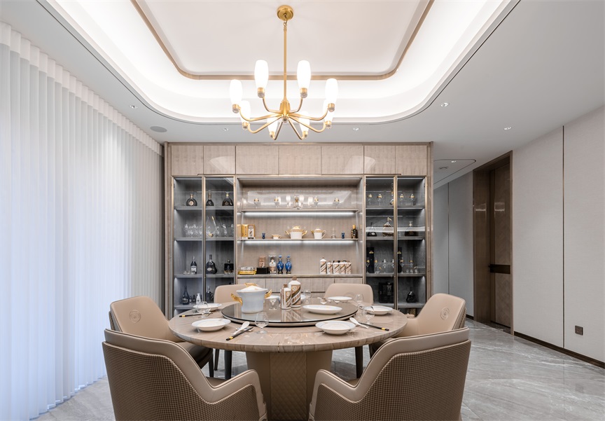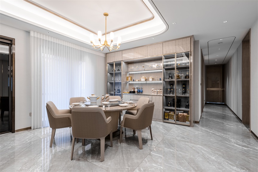 漢陽(yáng)世茂天胤這套550㎡的房屋面積較為寬敞,雖然整體結(jié)構(gòu)四四方方,但是空間中存在著不少的零碎角落,因此需要設(shè)計(jì)師將這些空間進(jìn)行合理的分配使用,在提升空間利用率的同時(shí)確保整個(gè)家居空間能夠更好的為業(yè)主所服務(wù)。而就餐區(qū)域與入戶(hù)門(mén)廳的狹小角落,就根據(jù)需求設(shè)計(jì)成一個(gè)小小的鞋帽間,滿(mǎn)足業(yè)主一家人出入替換衣物及放置物件的需求。