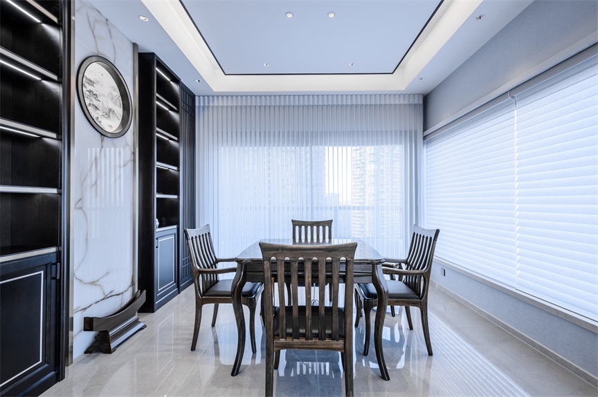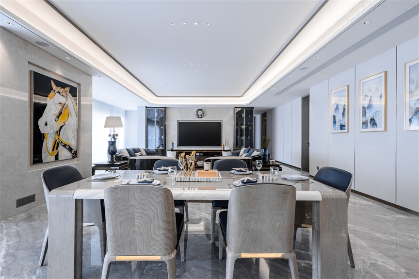 對(duì)稱(chēng)式的掛畫(huà)設(shè)計(jì)增添空間沉穩(wěn)大氣氛圍,大理石餐桌簡(jiǎn)約而又高貴,有效提升了就餐環(huán)境的氛圍與格調(diào)。