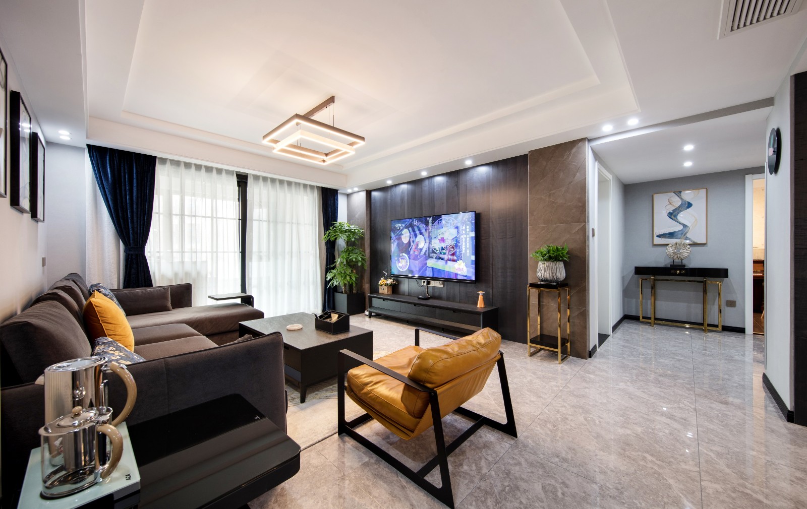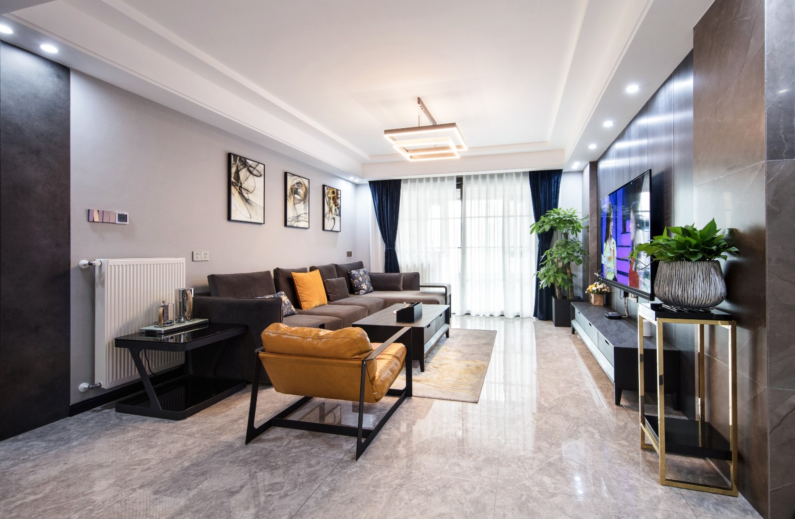背景墻與沙發顏色上的呼應保障了整個空間的銜接感,藍色絲絨窗簾、幾何造型燈飾,則增添了空間的摩登氣息。