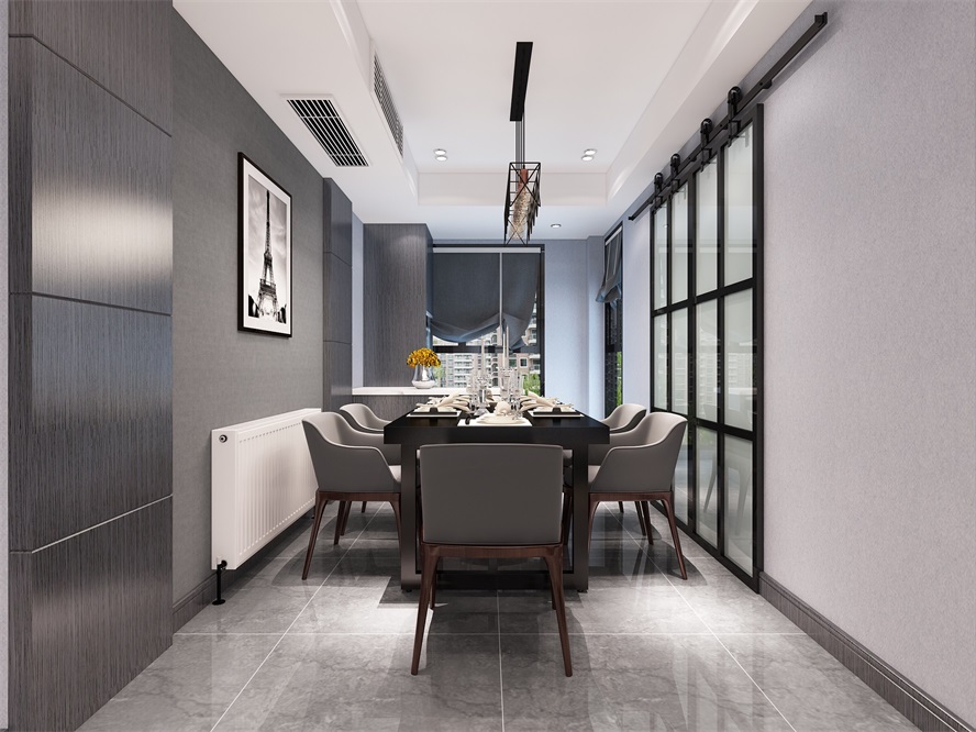 干凈的灰色墻面搭配上黑色餐桌,簡單而又不失個性感,同時為空間增添了沉穩氣息。