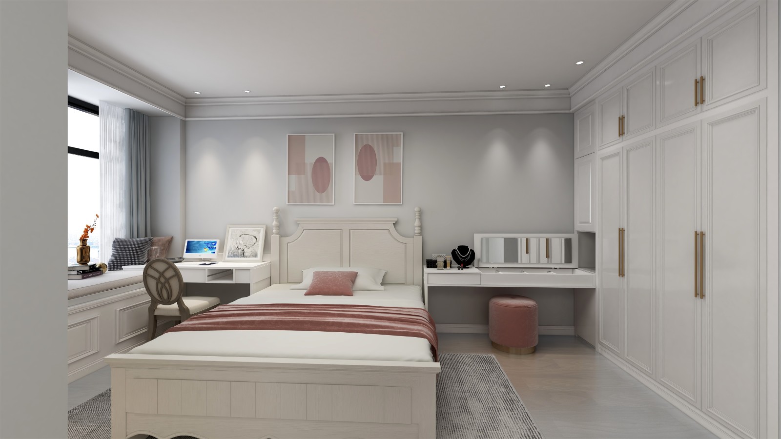 休憩空間使用與房屋整體裝修一致的白色,強調功能空間之間的銜接感,再搭配以少量的藕粉色,營造溫馨靜謐感。