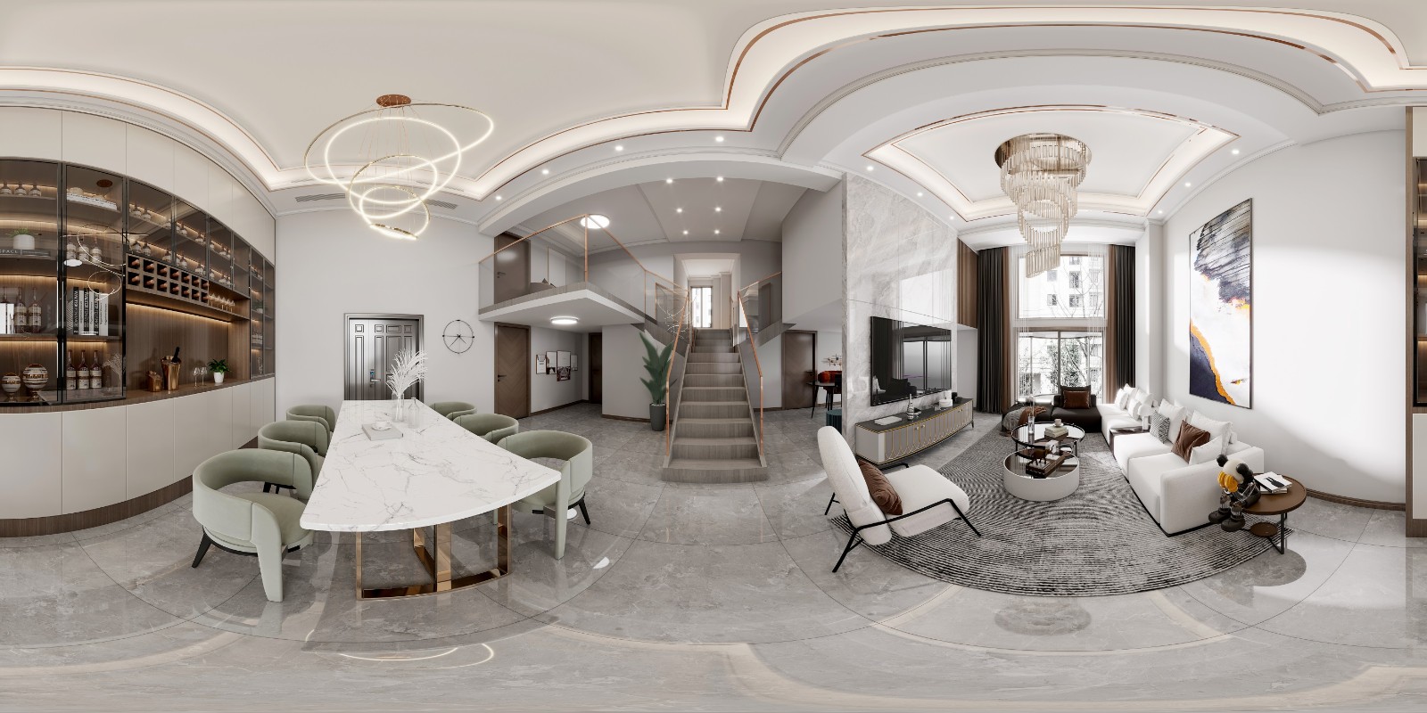 就餐區域被設置在一樓,借助大理石臺面打造餐桌,簡約而又不失輕奢高級感。