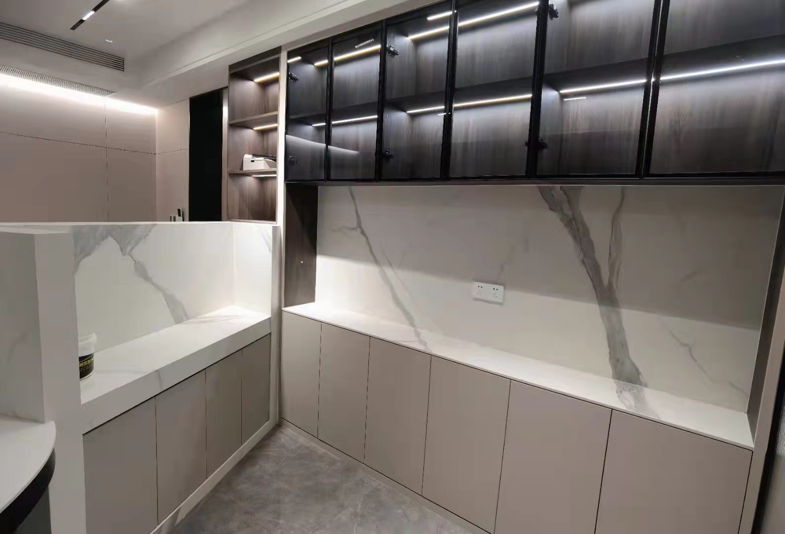 張家灣小區這套住宅的面積只有90㎡,原有的功能結構設計中只要兩個臥室,并不足以滿足業主的使用需求,因此設計師根據業主的需求與想法將陽臺盡頭區域的小空間改造成迷你保姆房,以提升空間利用率。就餐區域則設計在客廳區域的同一空間中,以減少空間浪費。半開放式的廚房設計現代感十足,且有利用提升家居空間的視覺通透感。