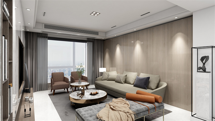 木質的沙發背景墻給人以溫厚舒適的自然問西崗,搭配上淺色沙發,營造清新優雅之美。