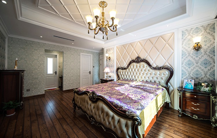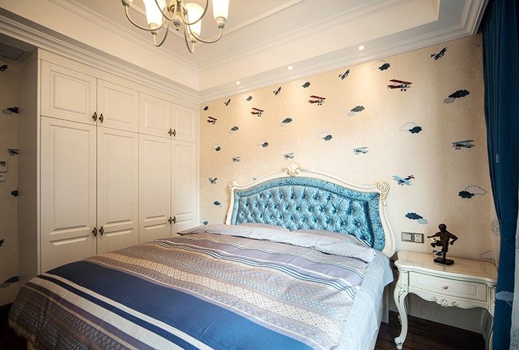 暗紋淺色壁紙簡(jiǎn)約清新而又不失格調(diào)感,復(fù)古燈飾與床具則強(qiáng)調(diào)空間歐式風(fēng)情。