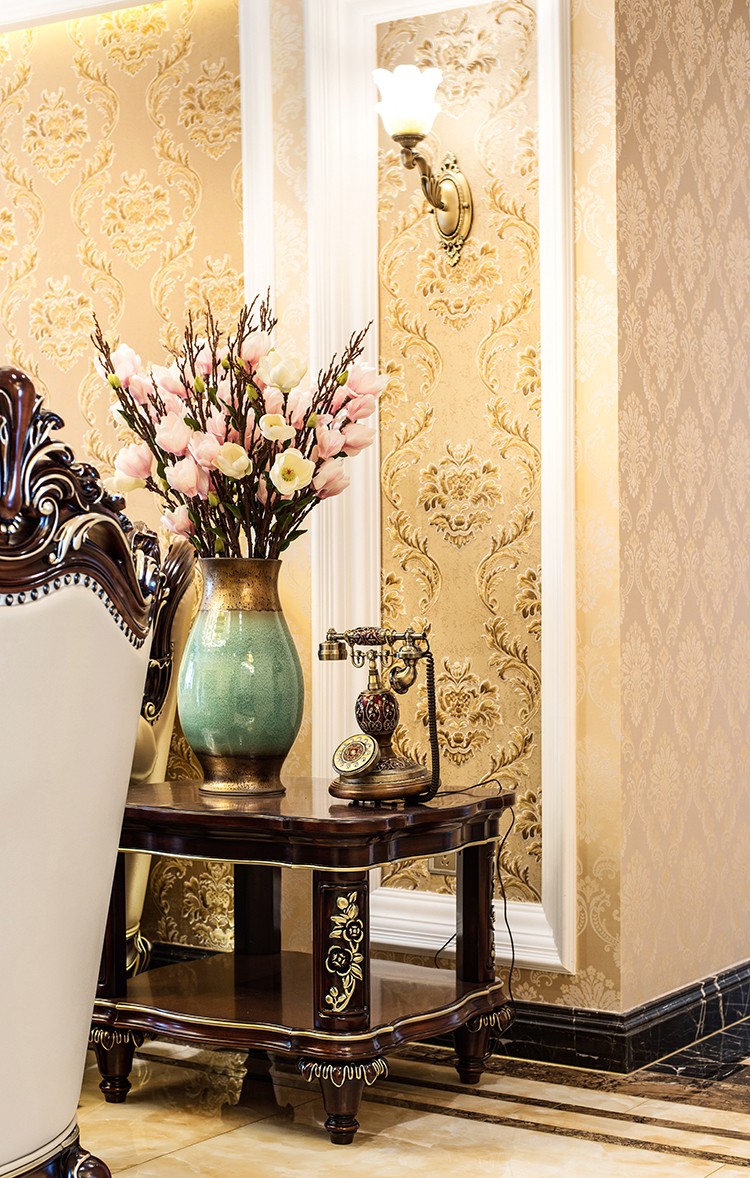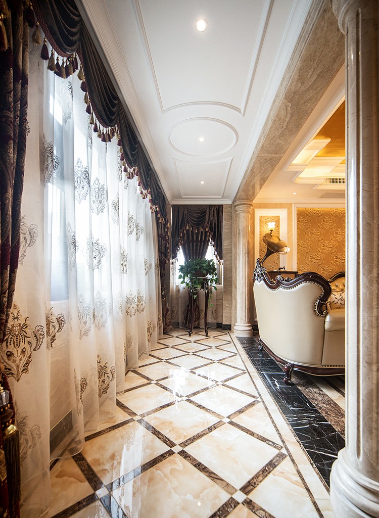 巨型清新歐式油畫打造的背景墻搭配上金碧輝煌的吊頂,讓人入門即可感受到歐式貴族氣息。