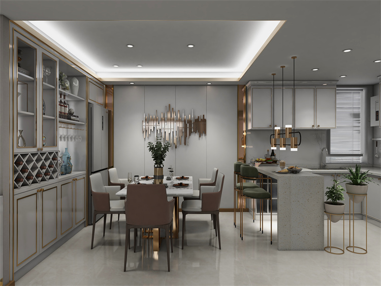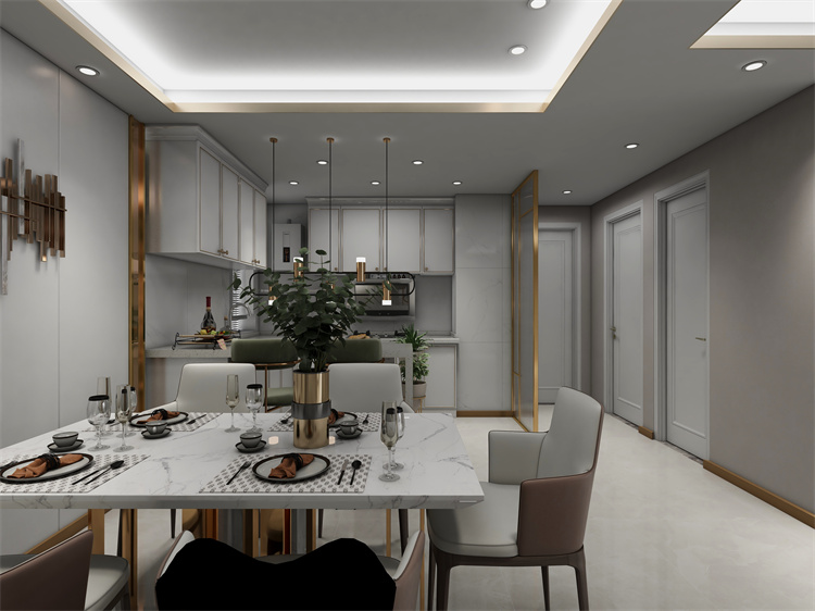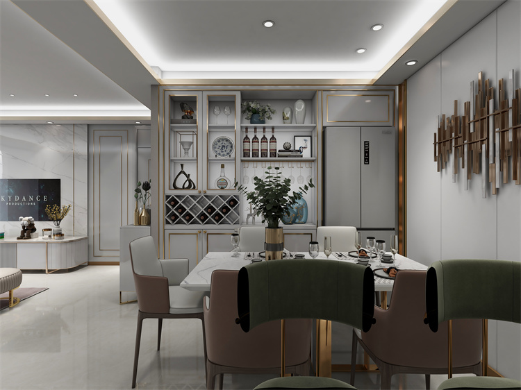 就餐區(qū)域沿用與客廳一致的白色及鑲邊處理,強(qiáng)調(diào)空間和諧感。墻面區(qū)域的簡單藝術(shù)擺件現(xiàn)代時尚氣息濃厚,為空間增添摩登色彩。