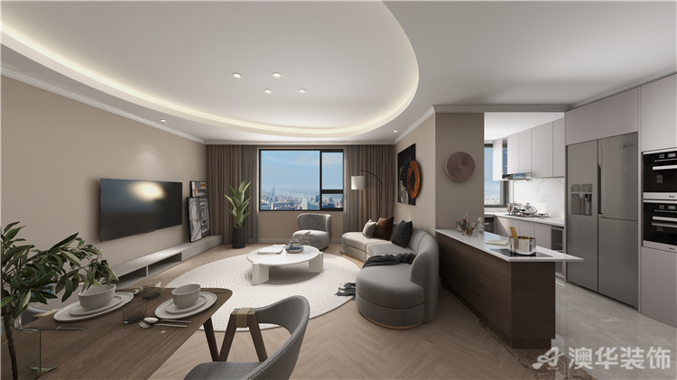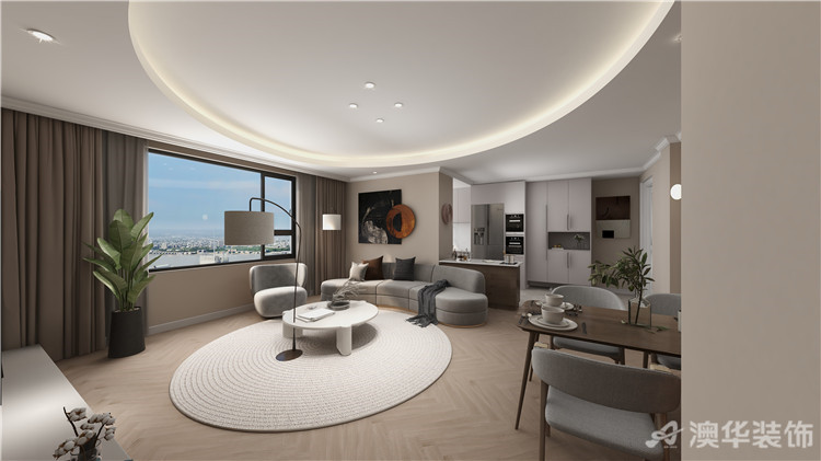 原本色搭配上白色強調空間簡約整潔氛圍,曲線型沙發、圓形吊頂以及圓形地毯則通過線條的變化來提升空間的獨特藝術氛圍。