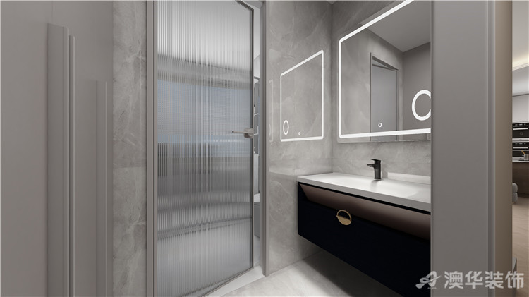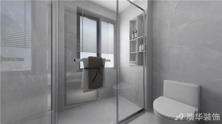 以白色包圍的衛生間整體呈現潔凈舒適氛圍,玻璃推拉門則有效起到干濕分離作用
