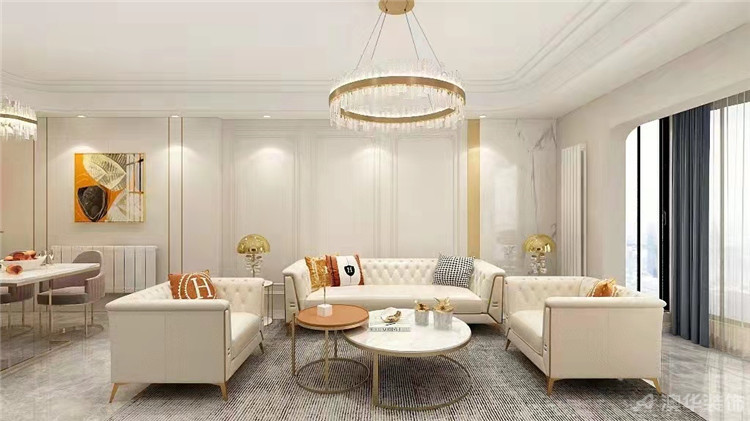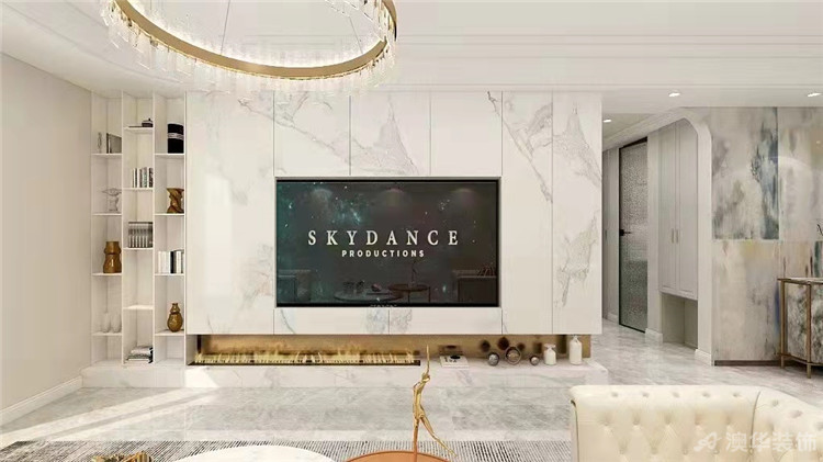 客廳與餐廳相互結(jié)合,功能區(qū)之間并沒有明顯隔斷,設(shè)計(jì)師通過燈具和背景墻的造型來進(jìn)行分區(qū),讓整個(gè)空間變得更加和諧舒適;電視墻使用了大理石鋪貼,并在左側(cè)增設(shè)了收納柜,讓客廳空間變得更加富有時(shí)尚感和層次感。