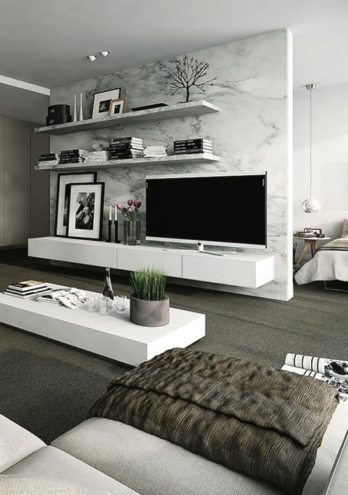 ▲近幾年很火的大理石元素,如果你是它的真愛粉,不妨直接將電視墻做成整面大理石,簡約優(yōu)雅卻不單調(diào)。