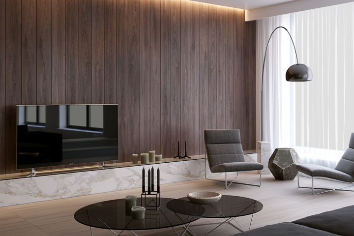 ▲現(xiàn)代極簡空間沒有任何花哨的元素,氣場全靠裝飾物的質(zhì)感和線條在撐,比如Flos的釣魚燈,以及一整面的深棕色實(shí)木背景墻。
