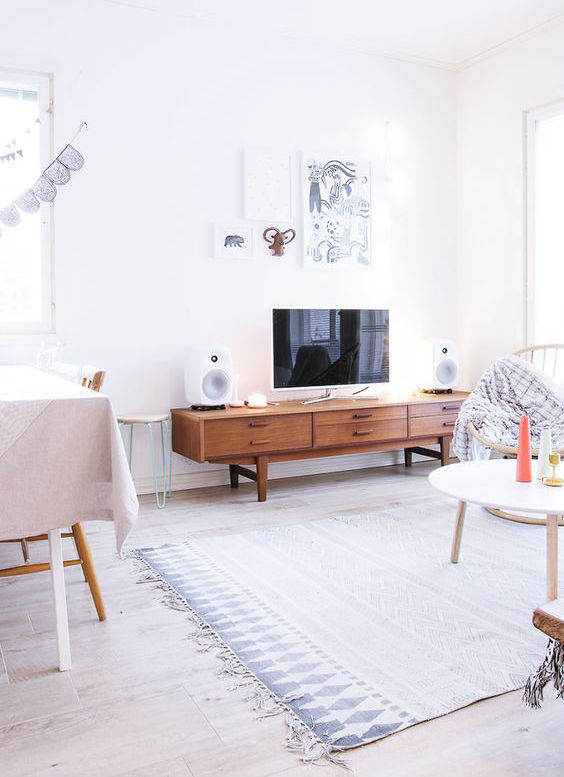 ▲任何處理都不做的素顏大白墻同樣可以很美,只要用一個(gè)平臺足夠大的電視柜,在上面打造一個(gè)植物+框畫+電視的靜物組合,就能成為客廳的視覺亮點(diǎn)。