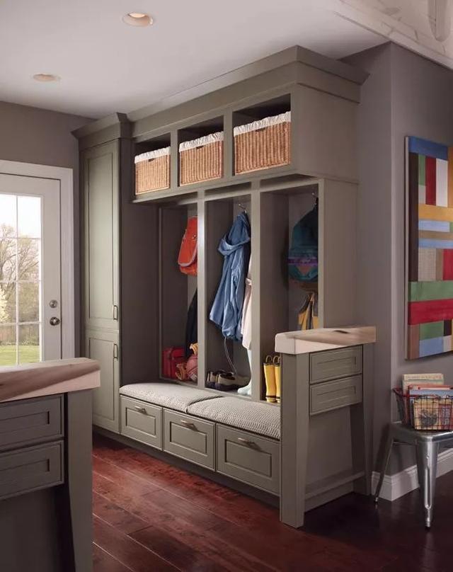 集鞋柜、置物柜、掛鉤、儲物籃、座椅等等功能于一身的柜子,可以坐著輕松地換鞋了,對于家里有老人的,非常方便實用。