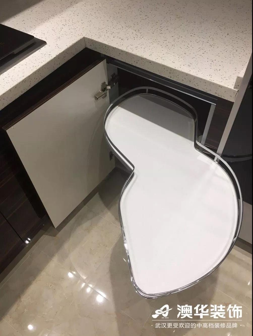 增加櫥柜長度的同時,「U」型櫥柜也為我們增加了兩個轉角。這兩個轉角所形成的盲柜,由于進深空間很大,拿取物品并不是很方便。