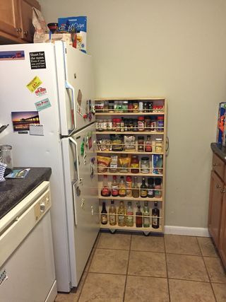 ▲冰箱和墻面之間的縫隙,用小滑輪置物架收納各種瓶瓶罐罐和調味料,這樣廚臺就不會被占用太多空間了,而且油煙也不會沾到調料上。