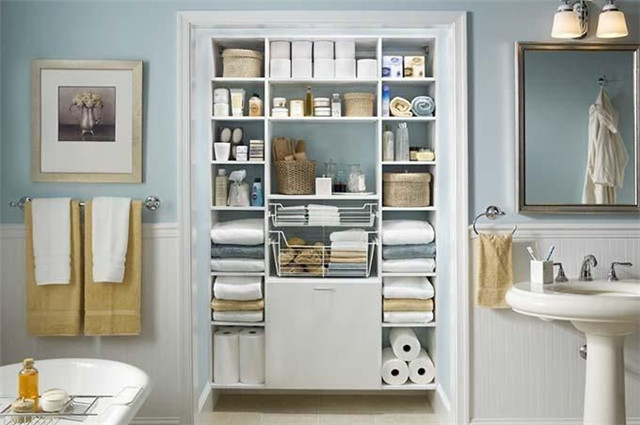 衛浴間是潮氣比較重的地方,合理收納也要保持物品干凈衛生。因此防潮就非常重要,臥室和衛浴間之間最好有推拉門或浴室隔斷。浴巾之類的物品應該放置在朝陽處,多進行曬涼。而衛浴間使用的剃須刀和電吹風應該收納在柜中,避免和潮濕的毛巾放置在一起,才能更好的隔離濕氣。