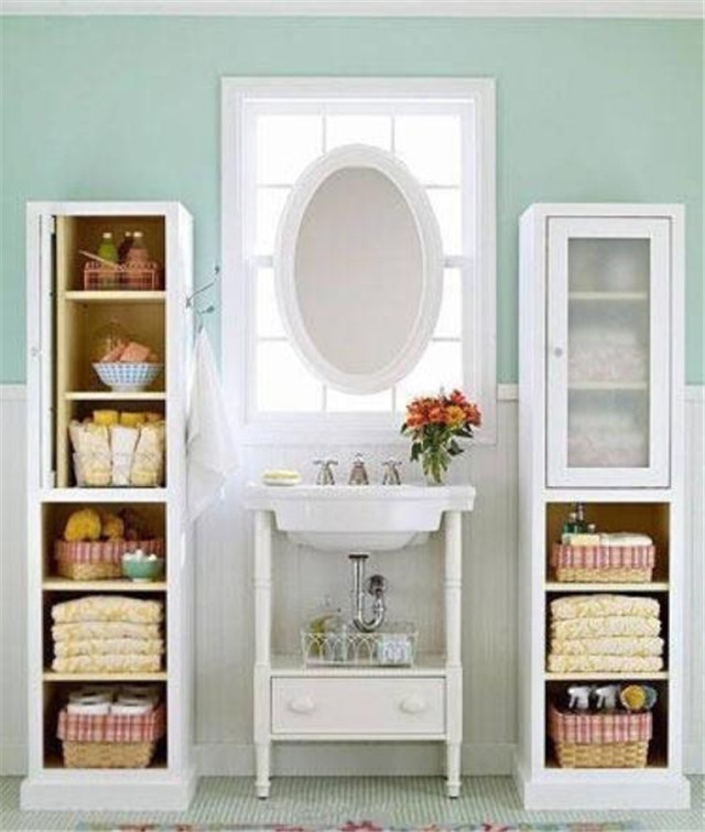 洗手臺區域可利用的空間很多,也是浴室中使用頻率最高,零碎物品最多的地方。這個區域的收納做得到位,會使整個衛浴空間看上去更整潔。在洗面盆上方設置吊柜,下方安置地柜,旁邊還可以安置掛桿,這樣的方式能充分地利用洗手臺四周的墻面。