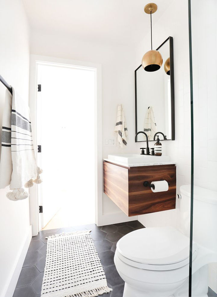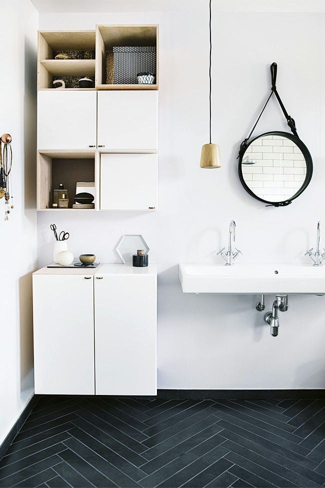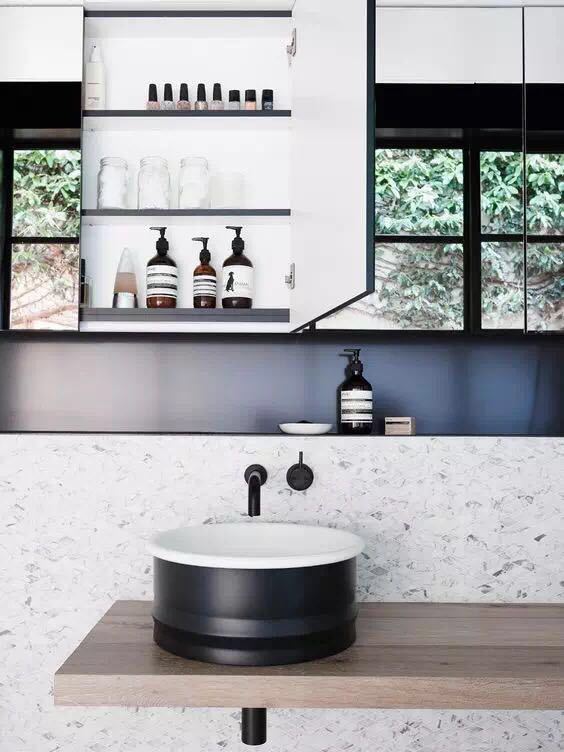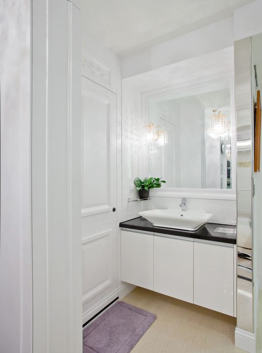 ▲收納柜、洗手臺等其他家具也要選擇壁掛式的。雖然緊貼地板的落地家具也可以避免家具下面的縫隙進灰,但在衛生間這樣充滿水汽的空間里,不利于延護家具壽命。所以干脆全部掛起來吧!
