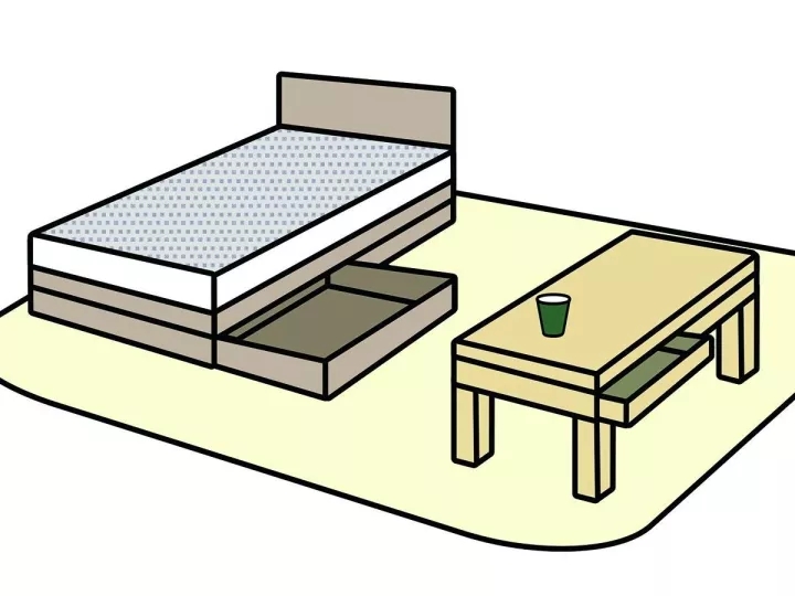 如床具、茶幾或餐桌可選擇底部有收納抽屜的款式,或工作桌也可以選擇有規劃門片、抽屜收納的類型為主。