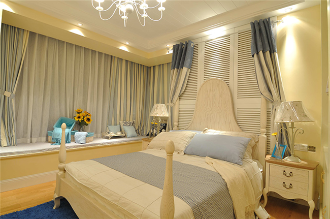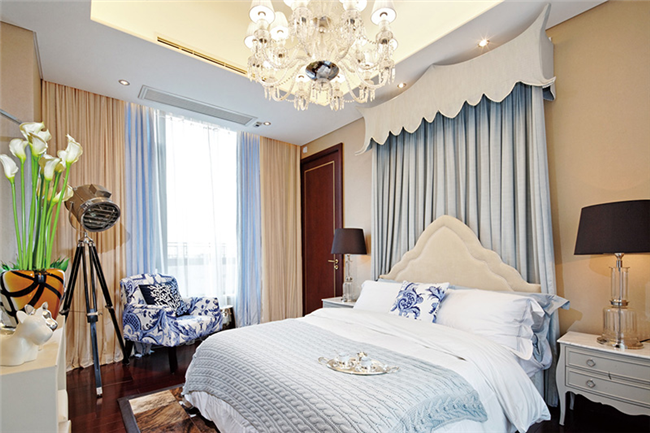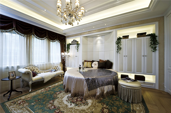 象牙白的床頭背景墻,采用軟包的手法,增加了臥室的舒適度。搭配米白色精致的床頭、歐式水晶燈和圓形床具,呈現出優雅華麗的空間設計。