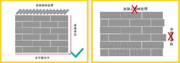 砌墻標線垂直平行,頂部斜磚鋪墊。頂部斜砌是為了使墻體頂部更密實,抹灰后不易開裂。