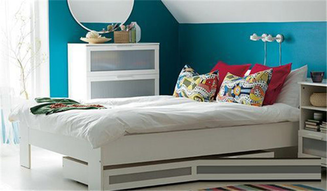 為了增加空間,可充分利用高度較高的床下空間,把東西擺在床底下。這種方法尤其適用于臥房空間小的房子,可選床架較高的床,這樣可供收納的空間就更多了。